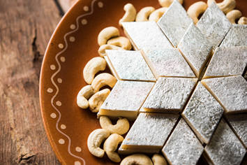 Kaju Katli: Kaju Katli, or Kaju Burfi, is a refined sweet made from finely ground cashews mixed with sugar and cooked into a smooth, thick dough. This mixture is then rolled out and cut into diamond-shaped pieces.