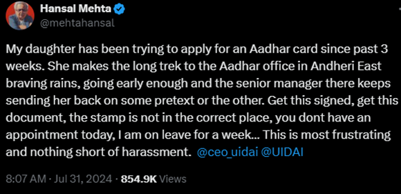 In his post, Mehta wrote, "My daughter has been attempting to apply for an Aadhar card for the past three weeks. Even in the rain, she visited the Aadhar office in Andheri East, only to be repeatedly turned away by senior staff for reasons like missing signatures, incorrect document stamps, or lack of an appointment. The constant excuses and delays have been extremely frustrating and nothing short of harassment."
