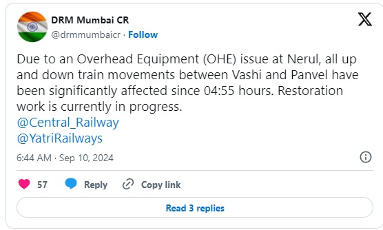 While services on the Harbour Line were restored by 6:55 am, Thane-Panvel local services remained suspended for a longer duration, causing frustration and inconvenience to commuters. Restoration work was closely monitored, and updates were provided via social media platforms. The DRM’s post on 'X' (formerly Twitter) alerted passengers to the ongoing efforts, stating, "Due to an Overhead Equipment (OHE) issue at Nerul, all up-and-down train movements between Vashi and Panvel have been significantly affected since 04:55 hours. Restoration work has been completed and train services resumed at 06:56 hrs."